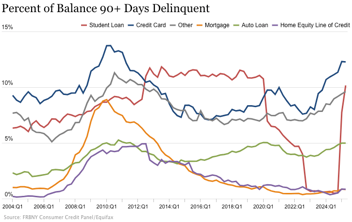 The delinquency rate in the highest-income 10% of ZIP codes climbed 73% in relative terms, from 4.8% in Q2 2022 to 8.3% in Q1 2025. Let that sink in. Even the wealthy are falling behind on credit card payments.
