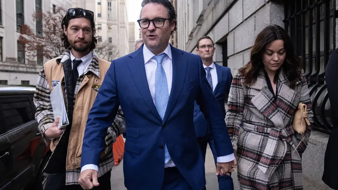 Trevor Milton, founder of Nikola Corp., center, exits court in New York, US, on Monday, Dec. 18, 2023. Milton was ordered to spend four years behind bars for lying to shareholders about the electric-truck maker's progress. Photographer: Yuki Iwamura/Bloomberg