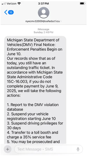 A copy of a fake text sent to a Michigan resident on June 8, 2025
