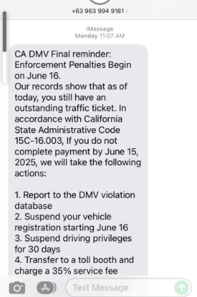 Screenshots taken June 19, 2025, of a text messaging scam alleging to be the state DMV.