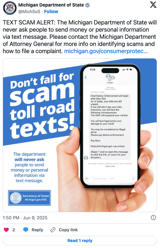 Michigan: Scam texts reference toll roads. Michigan has none. Still, thousands fall for it.