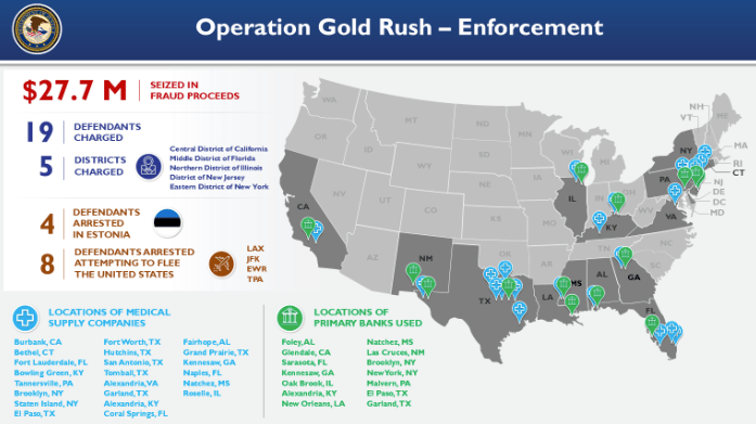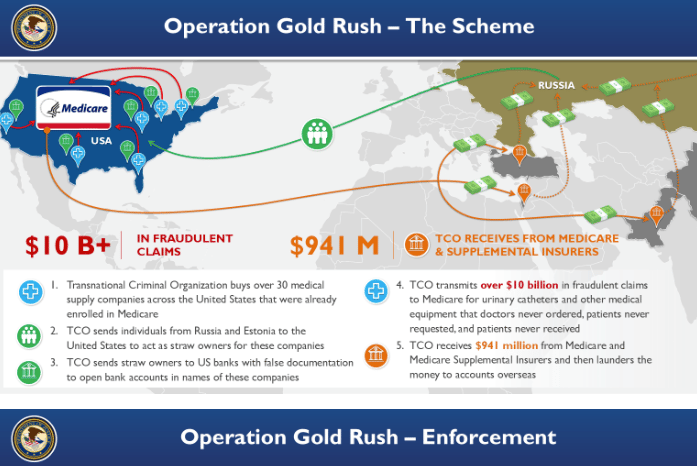 Operation Gold Rush | $10.6 B | Foreign straw owners snapped up dormant medical-supply companies cleared to bill Medicare for durable medical equipment (DME), then blasted the system with catheter claims using >1 M stolen identities. |